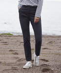 Flat front chino trouser. Tag free. Stretch fabric for ease of movement. Slanted front pockets, 2 back welt pockets, belt loops plain hem.